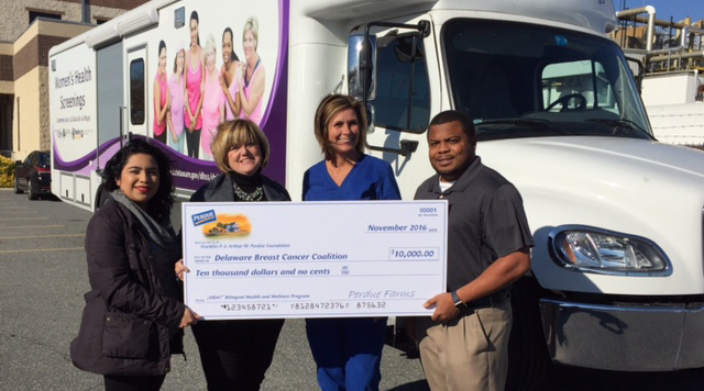 The Delaware Breast Cancer Coalition, Inc. has been on the front line raising awareness of breast cancer issues in the First State for the past 25 years. On Tuesday, November 22, the agency received a gift to help further its mission in the form of a $10,000 grant from Perdue, through the Franklin P. and Arthur W. Perdue Foundation.